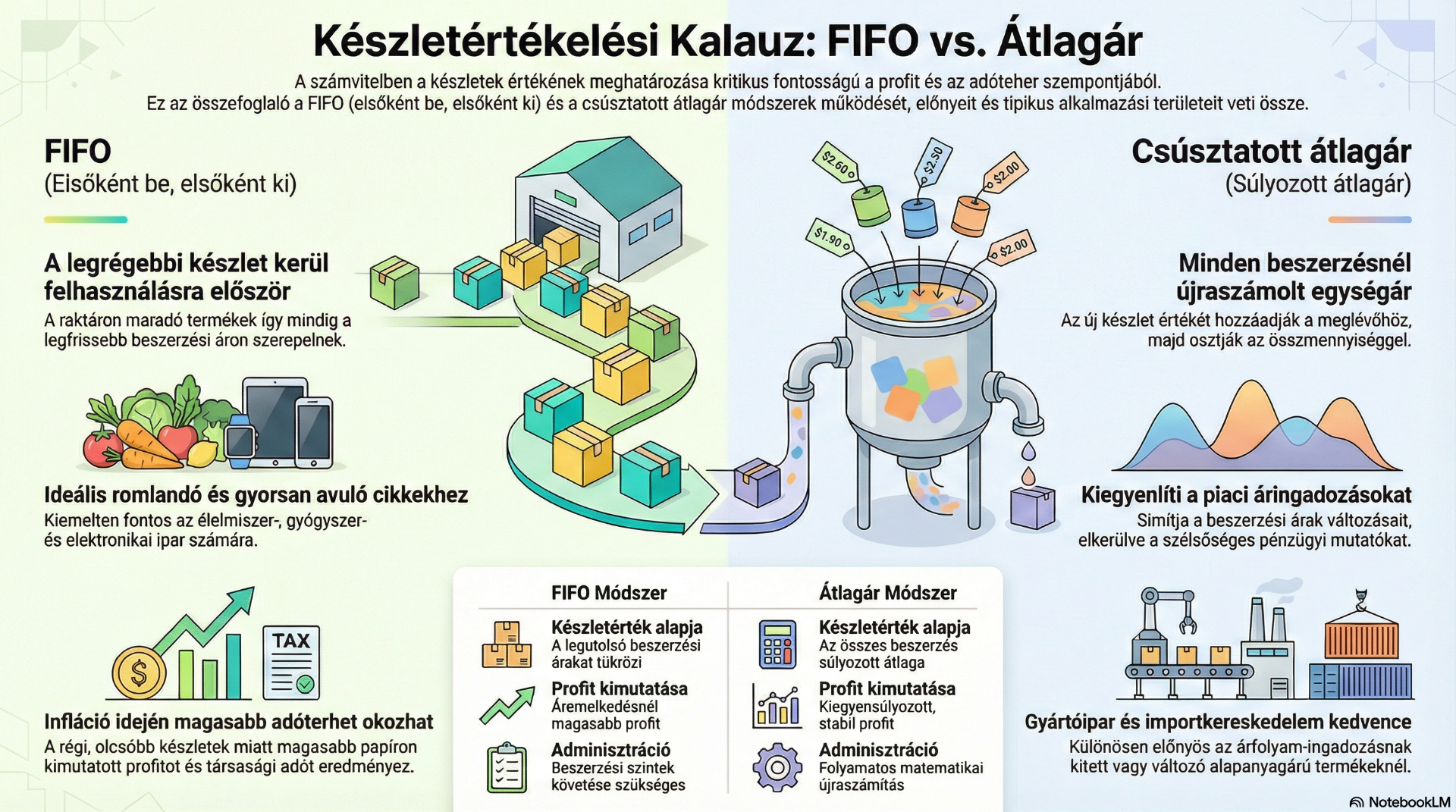 Az alábbiakban a FIFO (First In, First Out) és a csúsztatott átlagár (súlyozott átlagár) készletértékelési módszerek kerülnek bemutatásra.