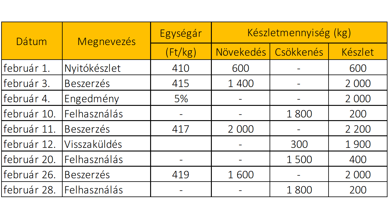 - A nyitó készlet 100 kg alapanyag 410 Ft/kg beszerzési egységáron. Az elszámolási betétszámlán 5 000 000 Ft van.