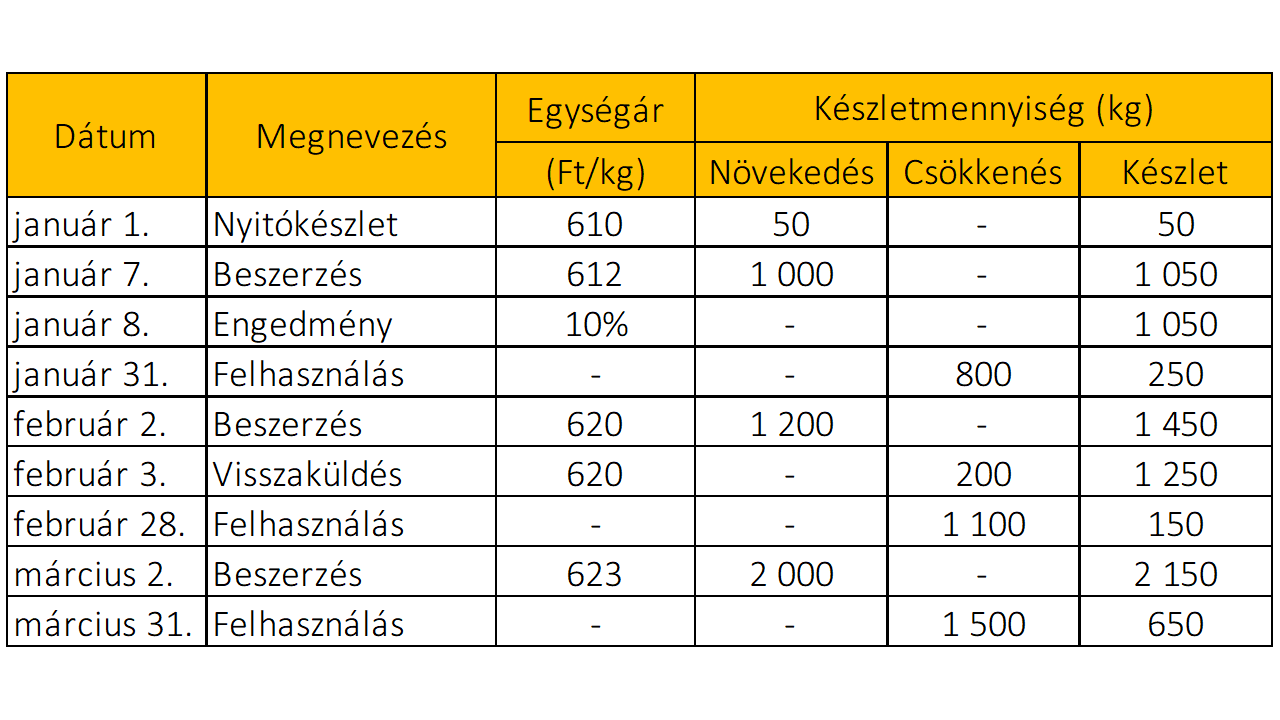 - Felhasznál a vállalkozás a termeléshez 560 kg alapanyagot. A készletcsökkenés elszámolását csúsztatott átlagár módszerrel végzik. (Az átlagárat 1 tizedesjegy pontossággal számolja.)