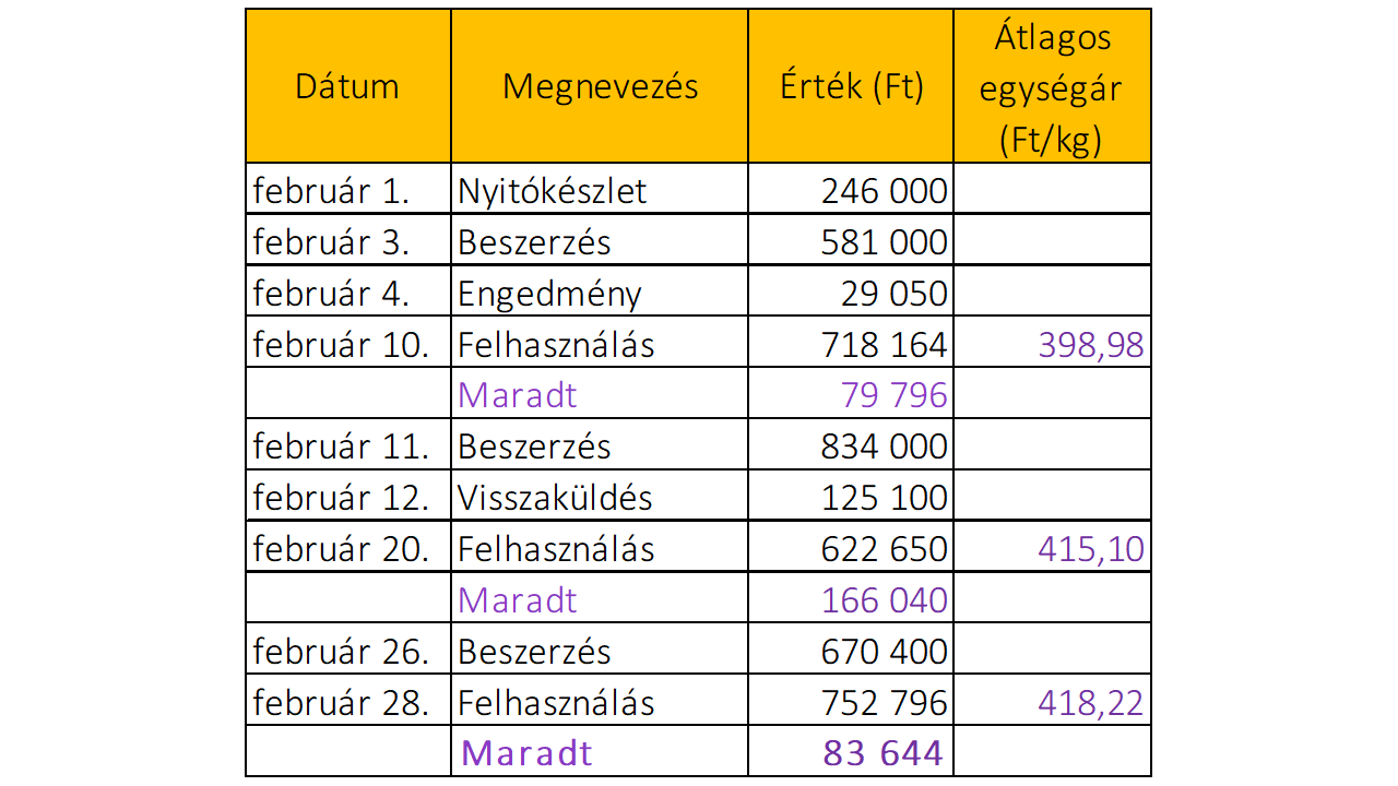 Határozza meg a február 28-i anyagfelhasználás után megmaradt készletmennyiség értékét csúsztatott átlagár módszerrel! (Az átlagárat 2 tizedesjegy pontossággal számolja!)