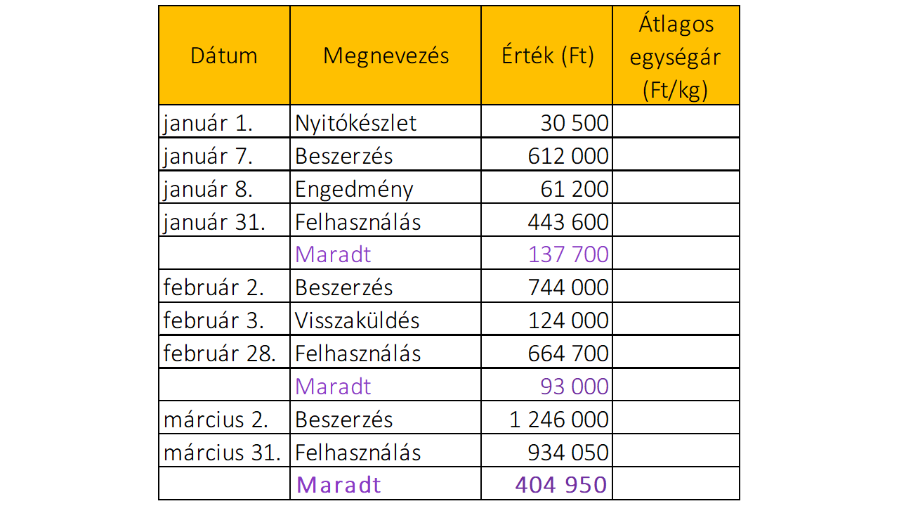 - Felhasznál a vállalkozás a termeléshez 560 kg alapanyagot. A készletcsökkenés elszámolását csúsztatott átlagár módszerrel végzik. (Az átlagárat 1 tizedesjegy pontossággal számolja.)