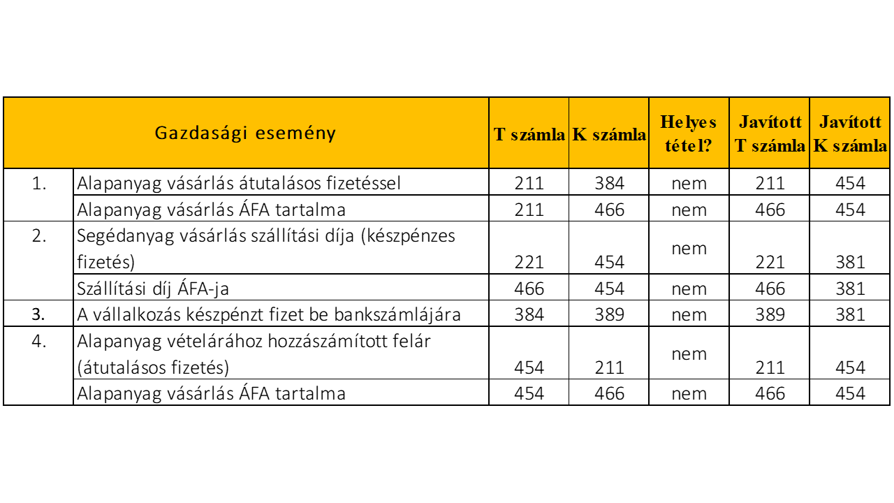Döntse el a következő gazdasági eseményekről, hogy helyesek-e! Ha hibásak, akkor írja le a javított számlaszámot!