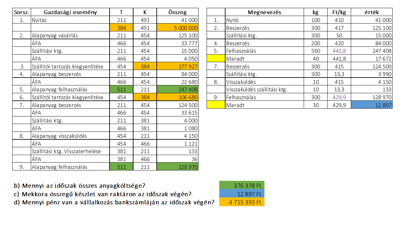 - A nyitó készlet 100 kg alapanyag 410 Ft/kg beszerzési egységáron. Az elszámolási betétszámlán 5 000 000 Ft van.