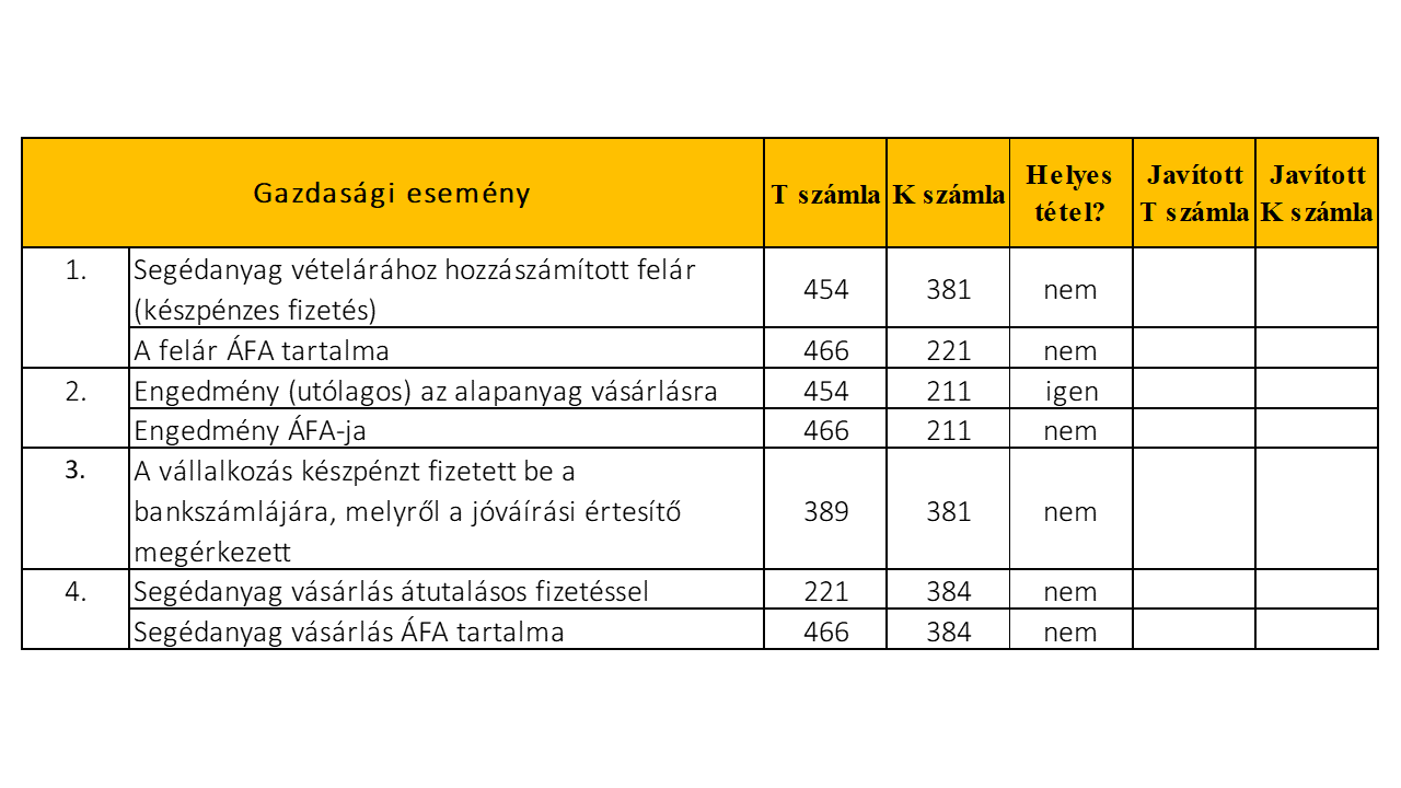 Döntse el a következő gazdasági eseményekről, hogy helyesek-e! Ha hibásak, akkor írja le a javított számlaszámot!