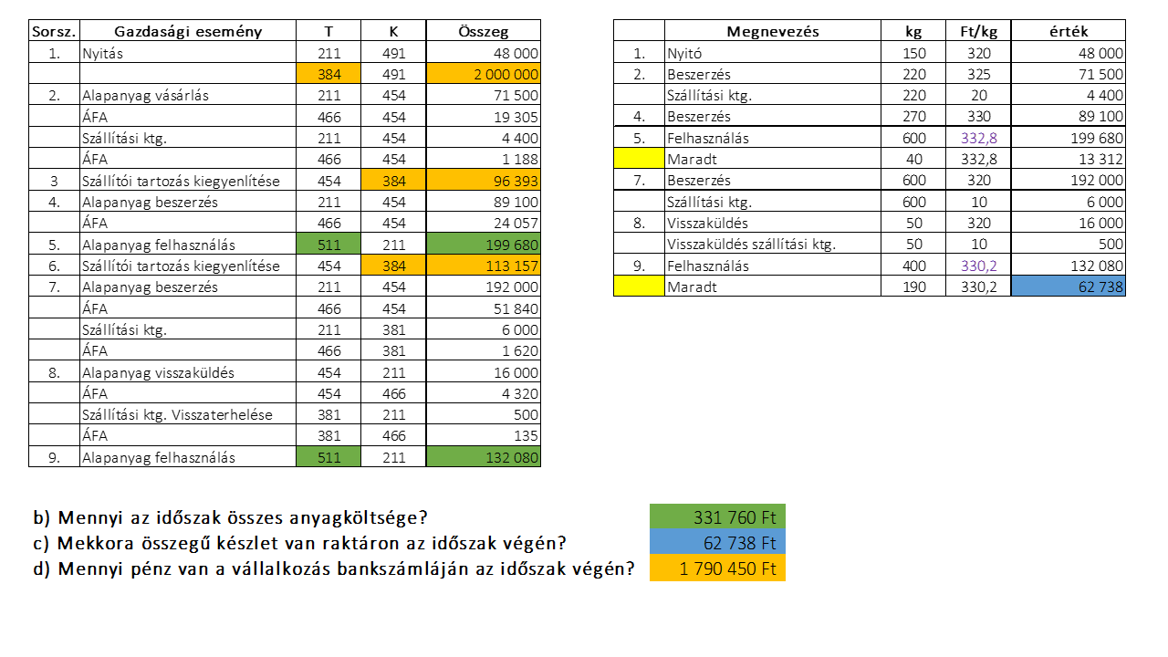 - A nyitó készlet 150 kg alapanyag 320 Ft/kg beszerzési egységáron. Az elszámolási betétszámlán 2 000 000 Ft van.
