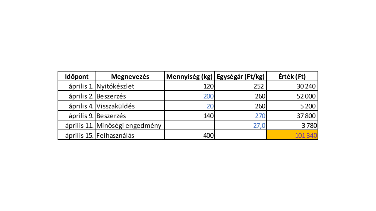 - Felhasznál a vállalkozás a termeléshez 600 kg alapanyagot. A készletcsökkenés elszámolását csúsztatott átlagár módszerrel végzik. (Az átlagárat 1 tizedesjegy pontossággal számolja.)