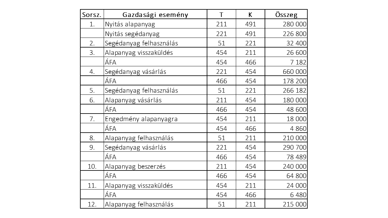- A nyitó készlet 4000 kg alapanyag 70 Ft/kg beszerzési egységáron és 700 db segédanyag 324 Ft/db beszerzési egységáron.